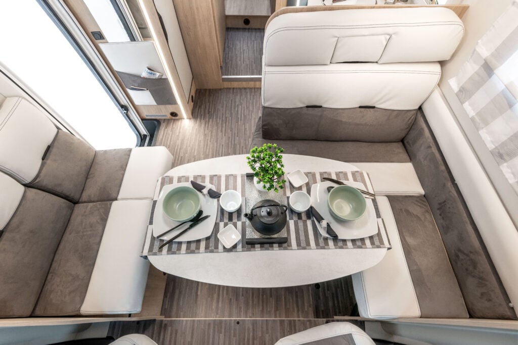 Dînette en L avec table à mouvement horizontal et transversal. Dinette repas est plus spacieux, en particulier du côté droit.