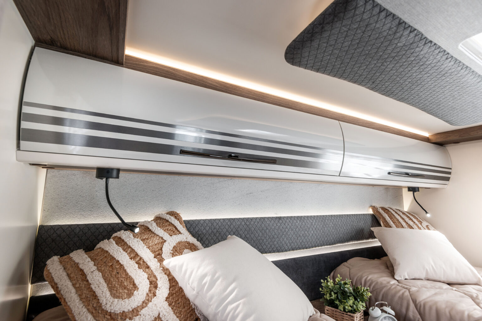 La autocaravana para los que buscan mucho espacio, zonas separadas y gran capacidad de almacenamiento. Cama doble central y zona de baño/ducha independiente.