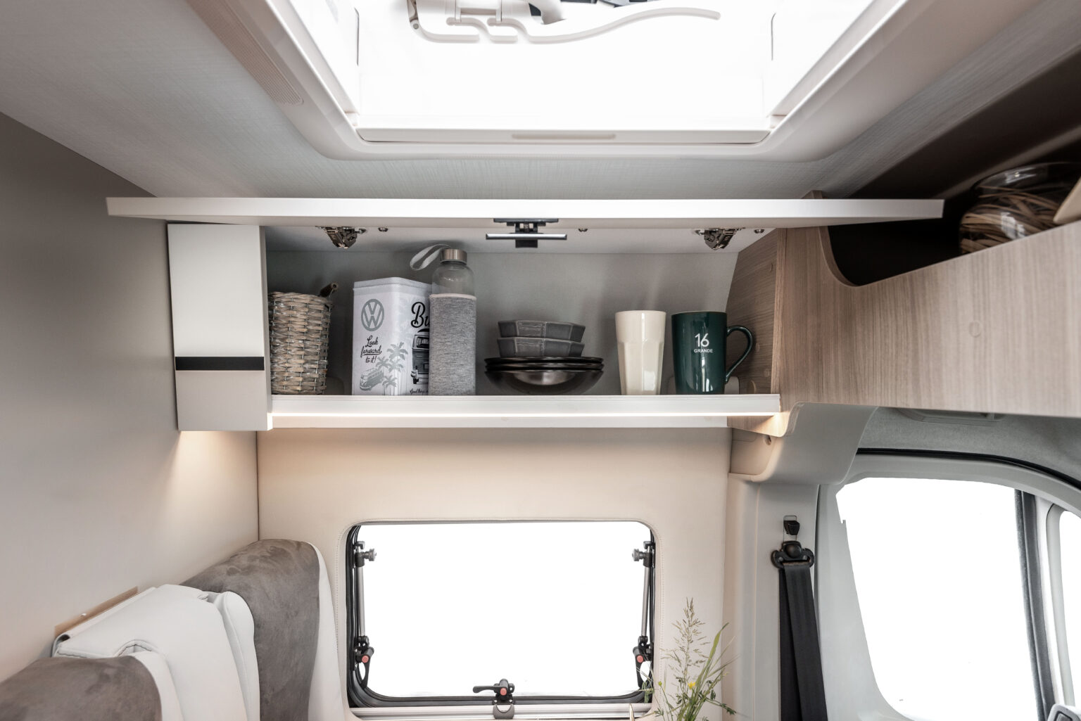 The area is airy and bright thanks to the large rear windows, the skyroof on the ceiling and the open side of the kitchen, which make the room more spacious. You can store your clothes in the lowered wardrobe and the two side wall units.