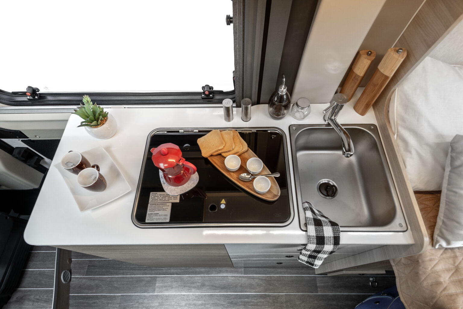 You can easily prepare any delicacy with the Kyros linear kitchen, equipped with a two burner hob and sink with domestic mixer.