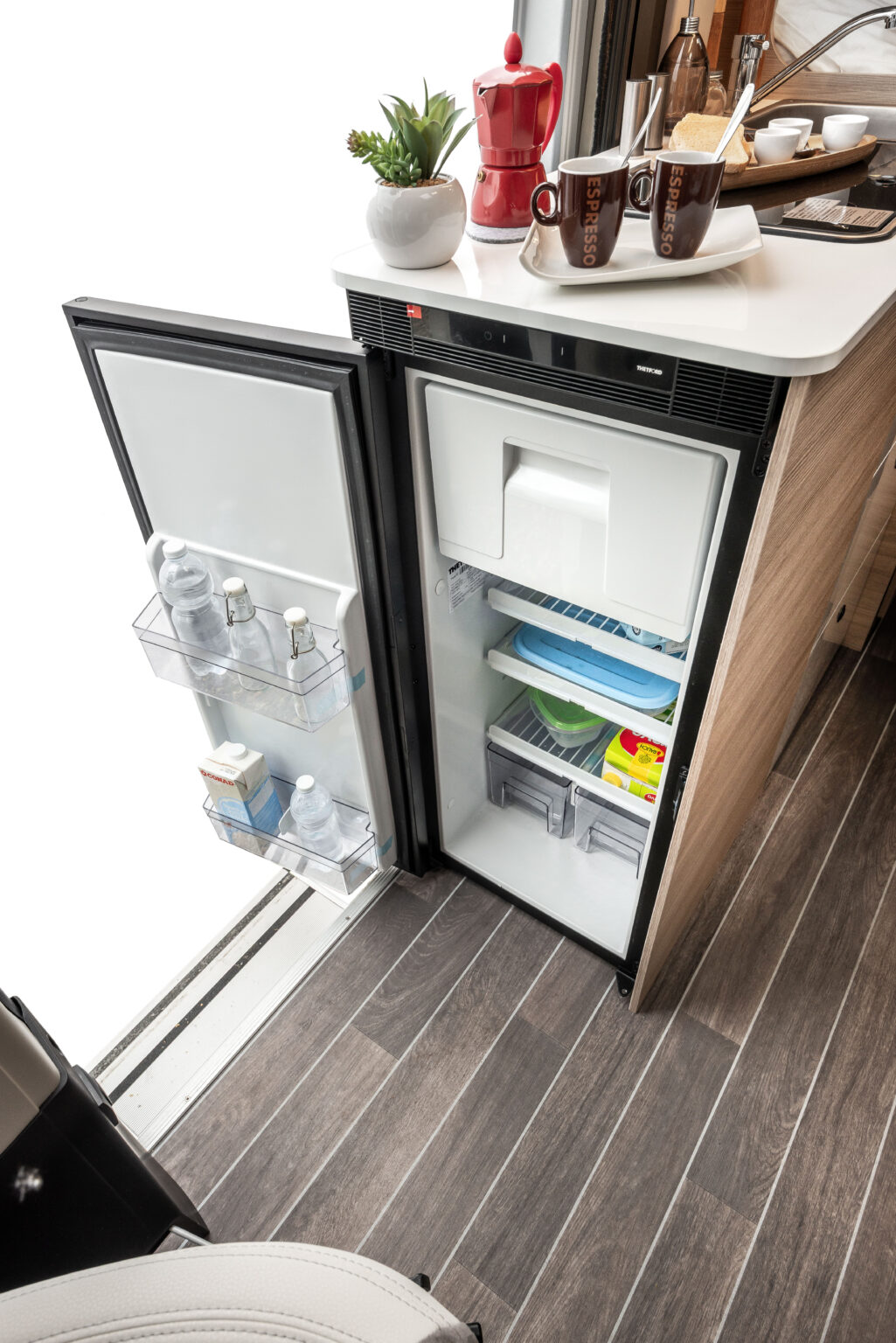Maximum convenience with the 70 l refrigerator with compressor, which thanks to its position and double opening allows you to stay comfortably outside and easily reach what you need.