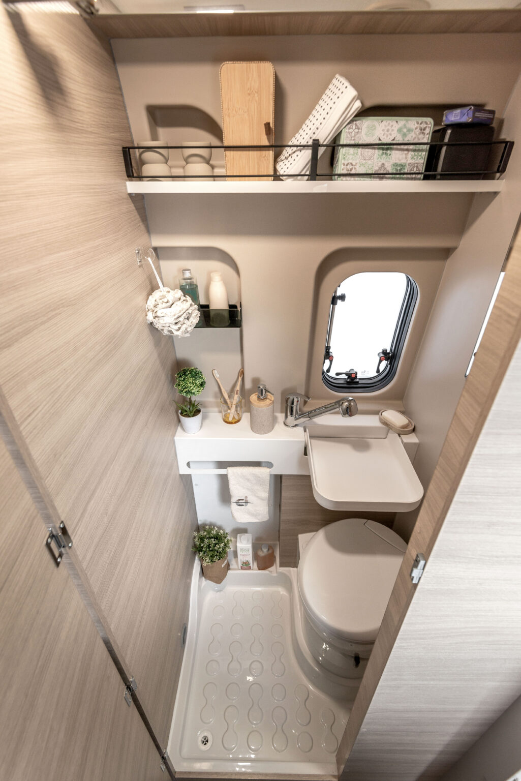 One space, two rooms. On one side the toilet with fixed washbasin on top and the window to ventilate and illuminate the bathroom. It is separated from the tent with magnets, removable, very practical because you can hang it out to dry.