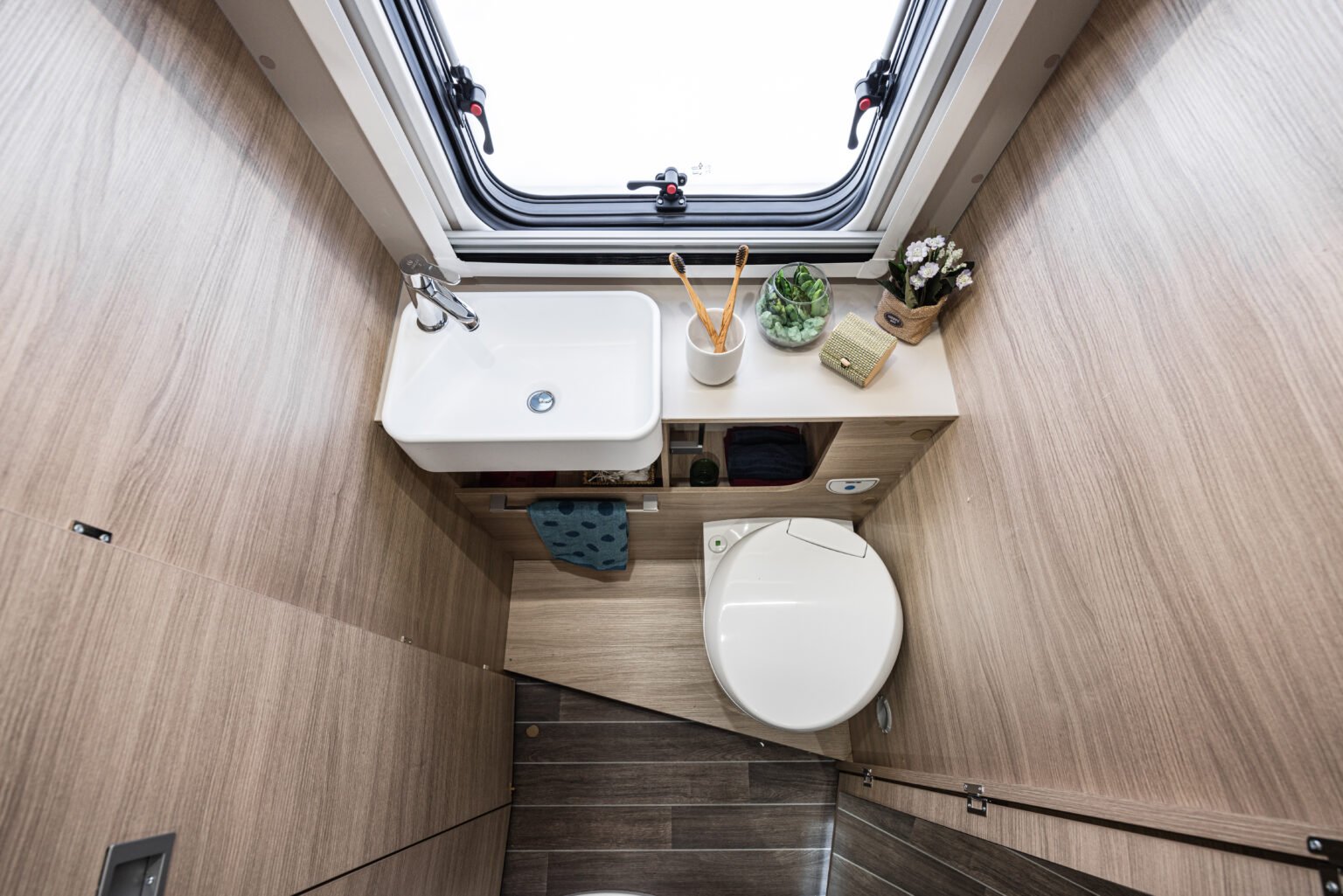 Il van ideale per equipaggi numerosi, fino a 5 persone. Tetto sollevabile con due posti letto di serie, bagno passante e letti posteriori singoli a castello.