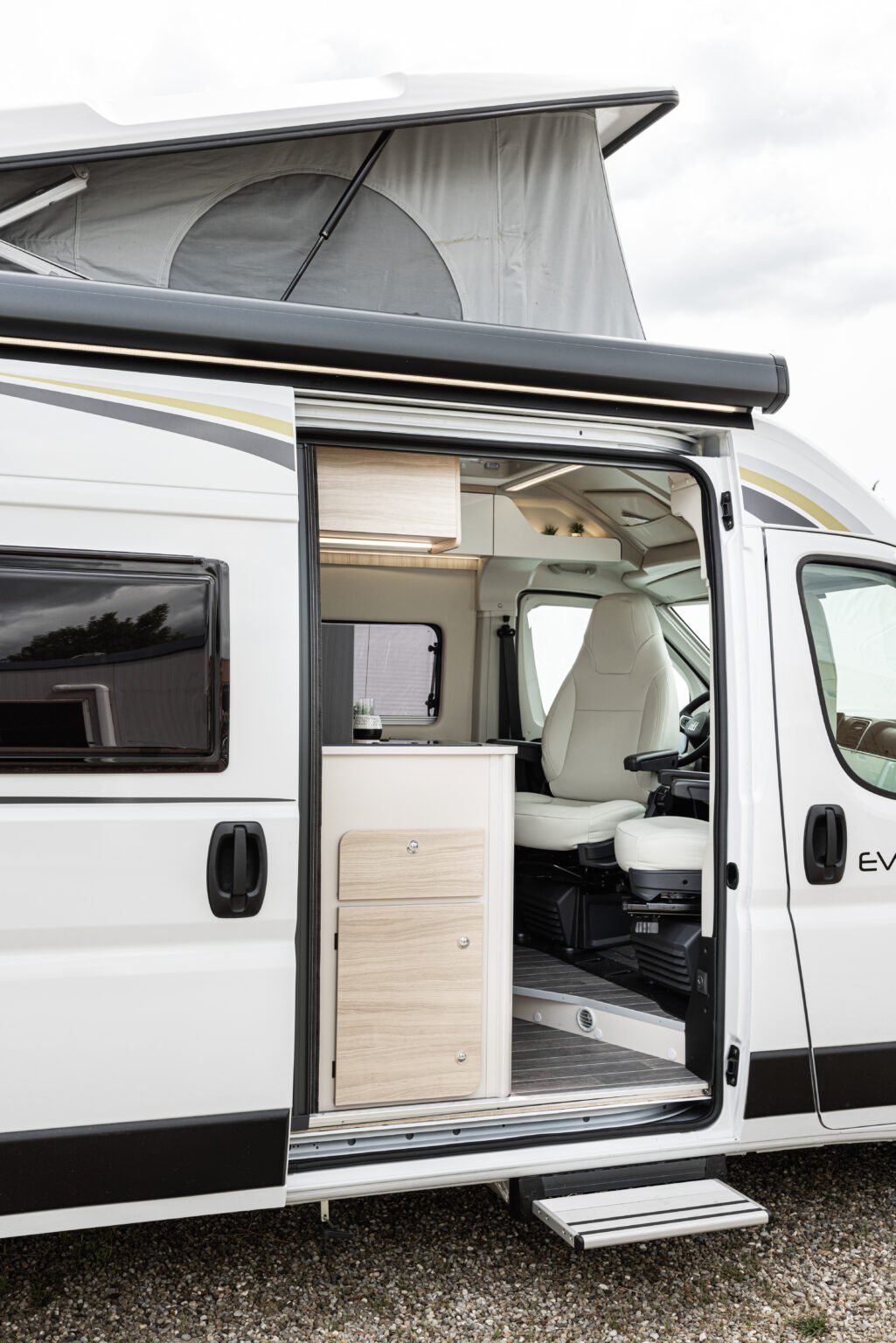 Il tetto sollevabile a soffietto con letto integrato di serie, offre due posti letto aggiuntivi. Questa soluzione ti permette di utilizzare la parte posteriore del van esclusivamente come spazio per lo stivaggio, creando più spazio per vivere la zona giorno in modo più ampio e confortevole. Un’opzione perfetta per ottimizzare gli spazi senza rinunciare al comfort.